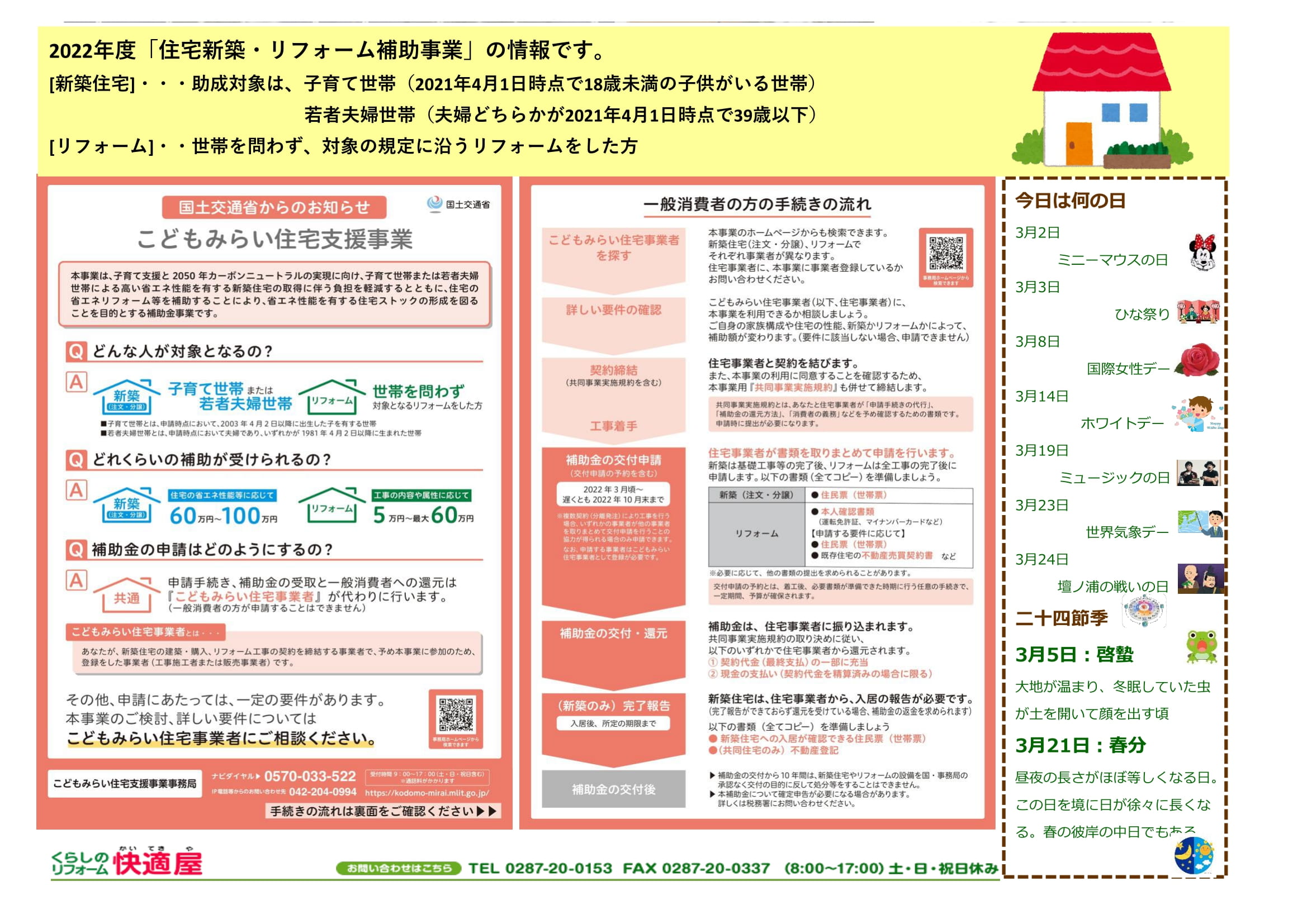 皆さま こんにちは ^^ 那須土木㈱「くらしのリフォーム快適屋」いつもの新米でございます。 今朝の大田原市は、薄っすらお化粧をしていました。 いつものことながら、私の居住地〝那須塩原市〟は、大田原よりも若干厚化粧気味だったのは内緒です🙃 いつ降ったのでしょうか。全く油断しておりました。 いつも家を出る30分前にフロントガラスの凍結確認をするため、カーテンを開けて様子を伺うのですが 外が真っ白なんですもの。いやぁ、焦りました。 私、雪が降った場合は〝いつもより20分早く家を出る〟を旨としているのですがね。 流石に今朝は、頑張って5分の短縮しか出来ませんでした。 もう、ドキドキですよ。時間に余裕をもって、初めて雪道に対することが出来る、私ですから。 心の準備、大切です。 そして、この画像。 いつもの時間に、何とか会社駐車場に辿りついて、歩き始めたところで小さな足跡を みつけました。これは、猫でしょうねぇ。 雪や雨でも降らなければ、猫の歩いた痕跡を目にすること、ありませんでしょ? 発見したこと自体が嬉しくて、時間が無いのにも関わらず写しました 🐾 さて、それでは前回申し上げました「快適屋ディスプレイ」と、「かいてきやだより」を。 お雛様も用意出来ると良かったのですが、少なからず紫外線の影響がありますから。本物の持ち込みは断念しました。 今回のディスプレイは、端午の節句まで、メインの装飾を入れ替えながら使用するつもりなのです。 いわば、省エネタイプの装飾(なんのことはない、新米が楽をしたいだけ ピーッ) 「ひな祭」後は、桜を増やして華やかさを出すつもりです。 そして遅くなりましたが、「かいてきやだより」2月号です。 今回は1面のみをアップいたします。 2面は「こどもみらい住宅支援事業」についての情報を 掲載予定なのですが、本日現在「快適屋」の事業者 登録が済んでいない状況のため、公開は差し控えました。 制度の概要 ・子育て世帯または若者夫婦世帯:新築住宅(注文・分譲)への補助 ・全世帯対象:リフォーム(対象となるリフォームをした方)への補助 国土交通省の「こどもみらい住宅支援事業」サイトに記載のある、住宅事業者で工事を行うと(登録事業者以外の業者での 工事は、補助の対象になりません)、登録事業者が取りまとめて申請を行なうというものです。 *申請にあたっては、対象それそれに一定の要件があります* 折角の制度ですから、新築やリフォームをお考えの皆さま、活用をご検討くださいませ。 詳しくは後日、資料を掲載申し上げます。 さ、今回は これでお暇いたします。 春は名のみの 風の寒さや ♪ ~♪ ですねぇ。 昨日は立春でした 🌷 すぐそこまで来ているはずですよ(春は控えめなコですから、なかなか主張しませんけどね) では (^.^)/~~~ |