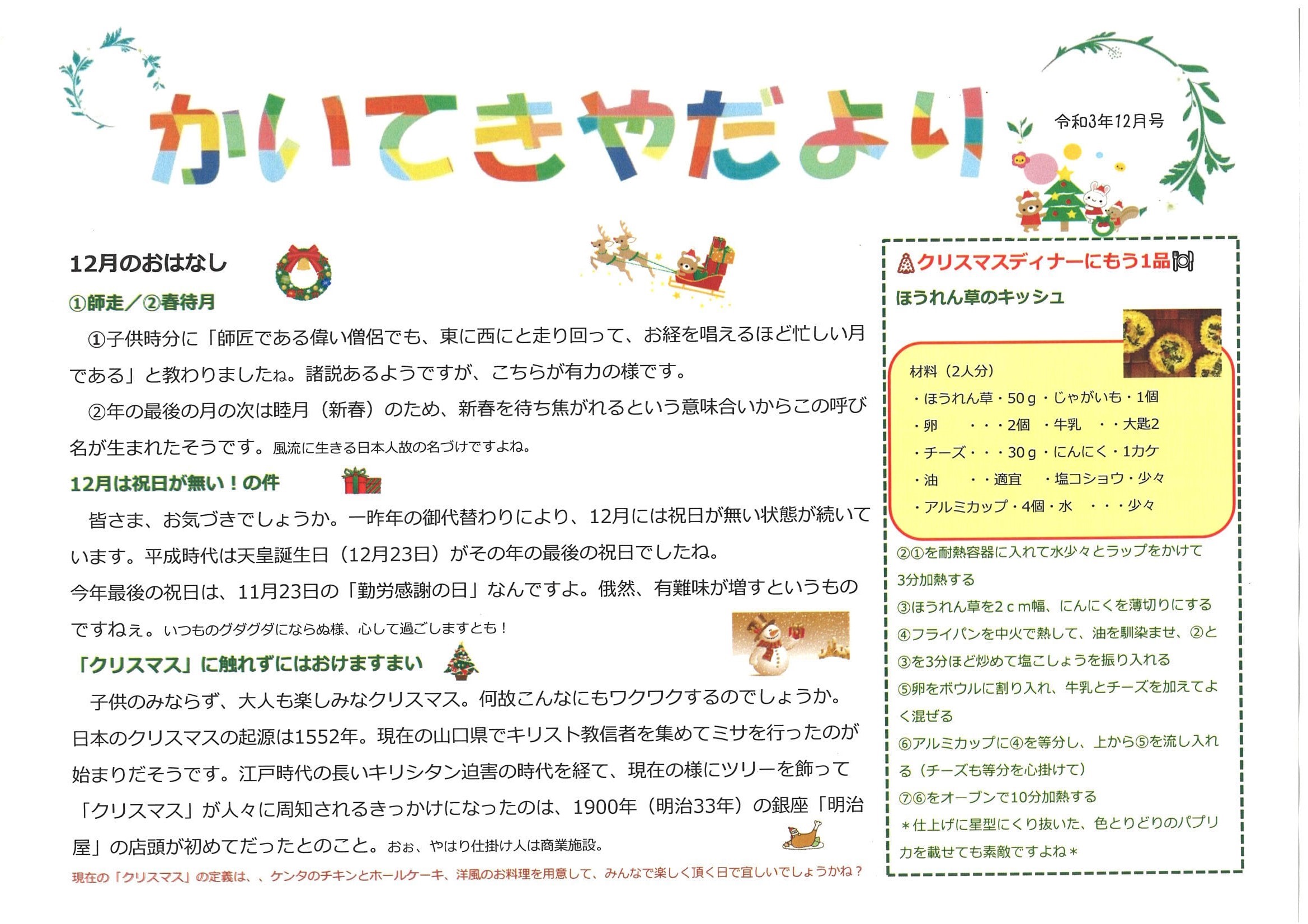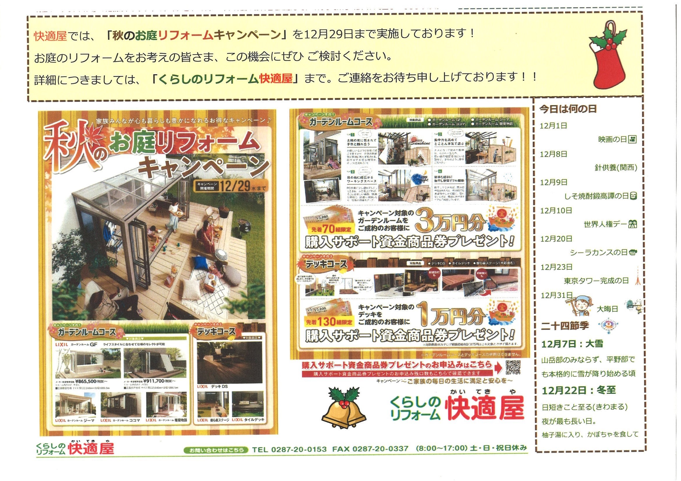 皆さま こんにちは ^^ 那須土木㈱「くらしのリフォーム快適屋」いつもの新米でございます。 ここ数日、穏やかな晴天が続いていますねぇ。 実は新米、大きな行事が終わって、若干脱力中なんですよ ^^; しかしながら、「今冬は寒さが厳しいかも」という予報を小耳に挟みまして、緩んだ気持ちが瞬時に 引き締まりました。怖さのあまり 😱 なんですか、ラニーニャ現象が発生しているらしいですね。数年前に大雪をもたらしたのが、この現象の影響とか。 事前に出来る準備って限られてしまいますけれど、まずは雪に対する心構えをしっかり持つことでしょうかね。 もう何度も経験しているのに 雪道に関しては、いつも初心者に戻ってしまう新米💦 (誠にもって情けない限りでございます) 立冬は疾うに過ぎましたが、快適屋で10月末から可憐な姿を披露してくれている、秋の花 リンドウをご覧頂きます。 この写真はやって来た日に撮ったものです(25日) 深い紫が美しいですよね。 このコ、晴れた日中には花びらを開いて、曇天の日には閉じているんです。 お花って不思議ですよね。どんなセンサーを持ち合わせているのか。。 毎日少しづつ水切りを施して、花が減ってきたら徐々に小分けにして、楽しみました。 リンドウの花言葉・・・正義、誠実(この凛とした佇まい、まさしく、、ですよね) そして、今週作成いたしました「かいてきやだより」12月号を。 以前の「かいてきやだより」でもご覧頂きました「お庭リフォームキャンペーン」が、いよいよ12月29日までの 開催となります。 お庭のリフォームをご検討中のお客様、この機会にぜひ、快適屋にご用命くださいませ 🙇 さてさて最後に本日、新米が頂戴した「クリスマスブーツ」です。 ニットの靴下で出来ているんですョ。 可愛らしいですよねぇ。 たぶん、大人になって初めて頂いたブーツだと思うんです。 皆さまも、子供の頃に一度は買って貰って、瞳を輝かせた記憶があるのでは。 どんなに長く大人をやっていても、おばちゃんでも、これは本当に嬉しいプレゼントでした。 ついつい、自慢したくなってしまったのです 😅 幸せをありがとうございます!みんなでエールを!! そうそう、この「クリスマスブーツ」日本発祥だって、ご存知でしたか? これを考えついた人って、夢があって、優しい人だと思いません? 👆 さ、今回はこの辺でお暇いたします。 来週23日は、今年最後の祝日「勤労感謝の日」ですね。 新米は自身を労う計画を練っています(ふふふ 😄) 皆さまは、どんな休日を過ごされるのでしょう。 では (^.^)/~~~ |