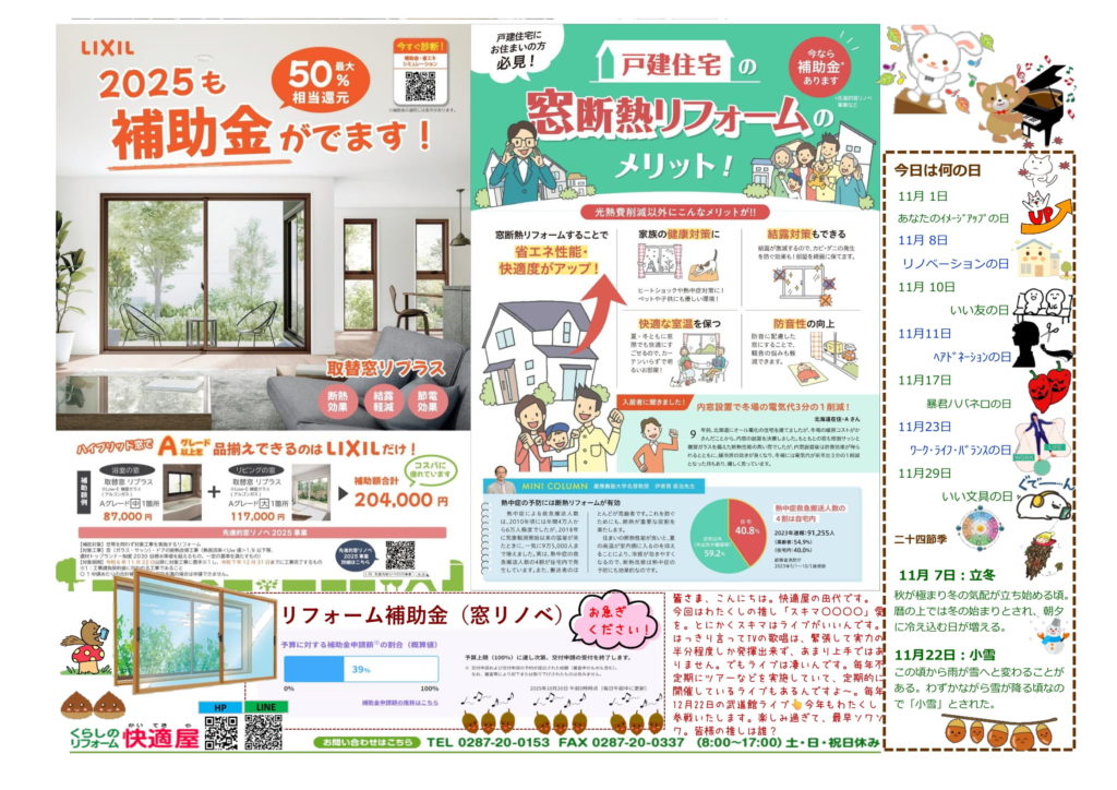 メインの話題は、現在流行期に入っていると思われる「インフルエンザ」ですね。感染防止のポイントについてを。さらに2面は、窓リノベの最終告知です。上限額までの予算にかなりの余裕はありますが、締め切りが迫っています。