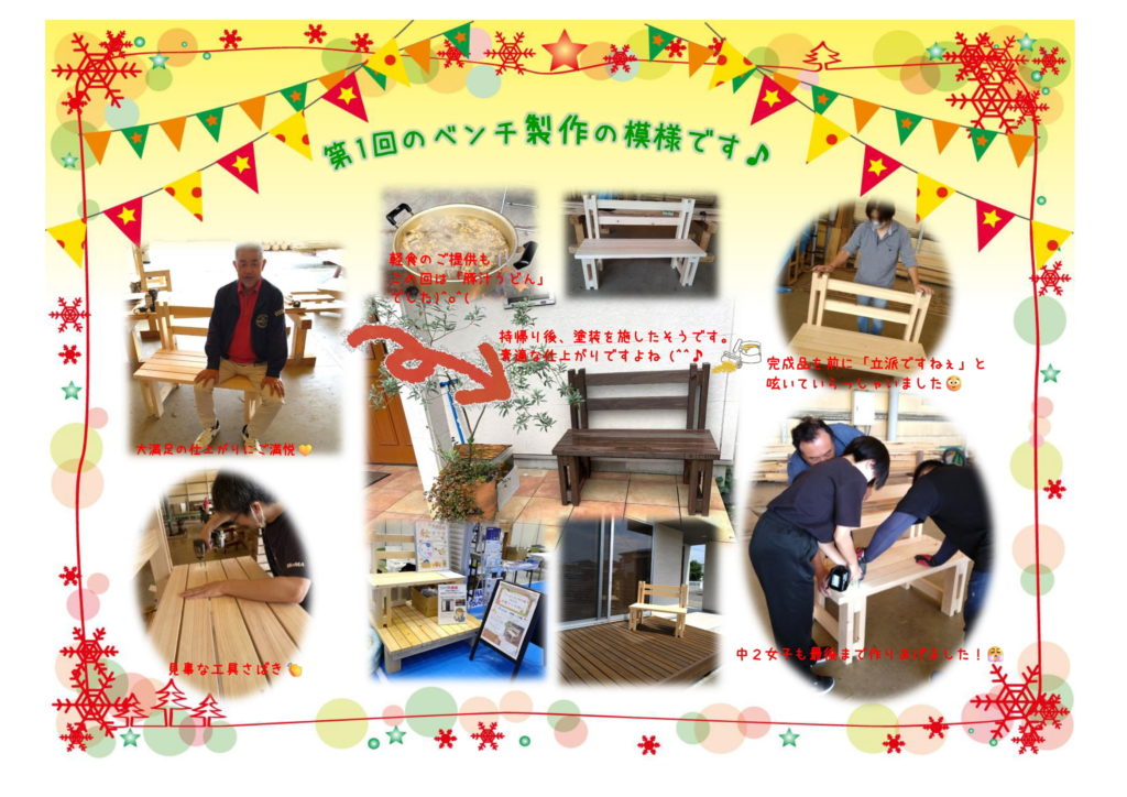 「やっぱり木が好き館」責任者の野望が上の画像に表れています。次々回の製作物をもってして、ベンチ、イス、ウッドデッキの3点セットが揃う寸法なんですね。皆さま、いかがですか?