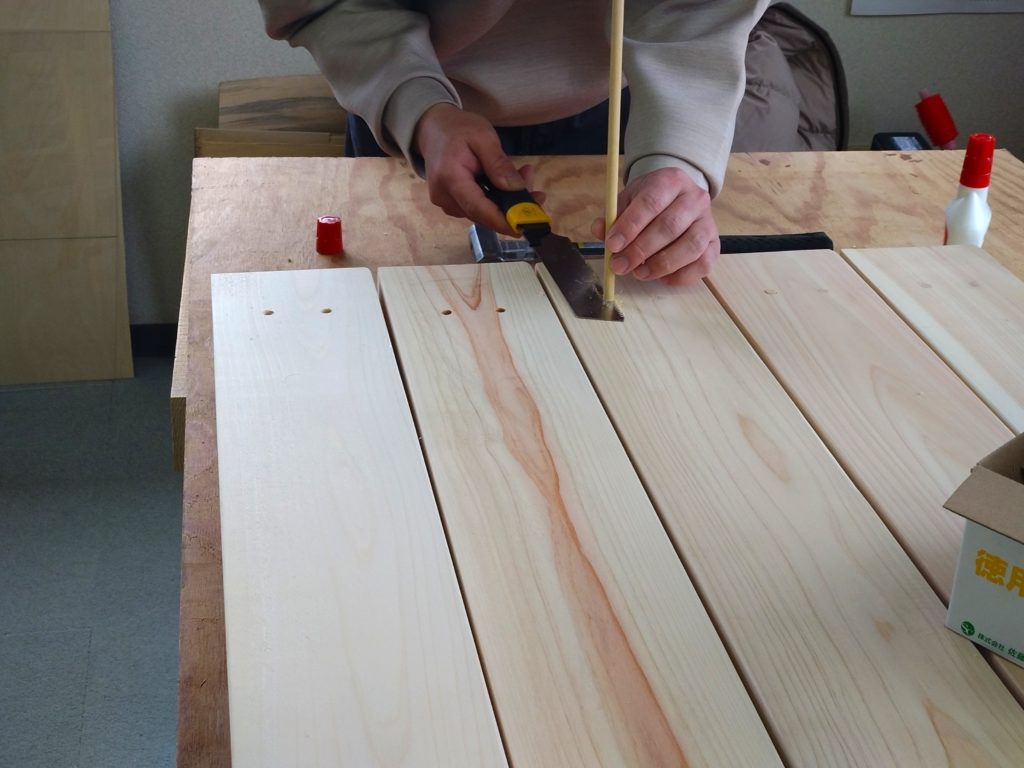 くださったお客様。この作業は、天板表面のビス穴をダボ(木栓)で塞いでいるところです。仕上がりが見違える様になります。